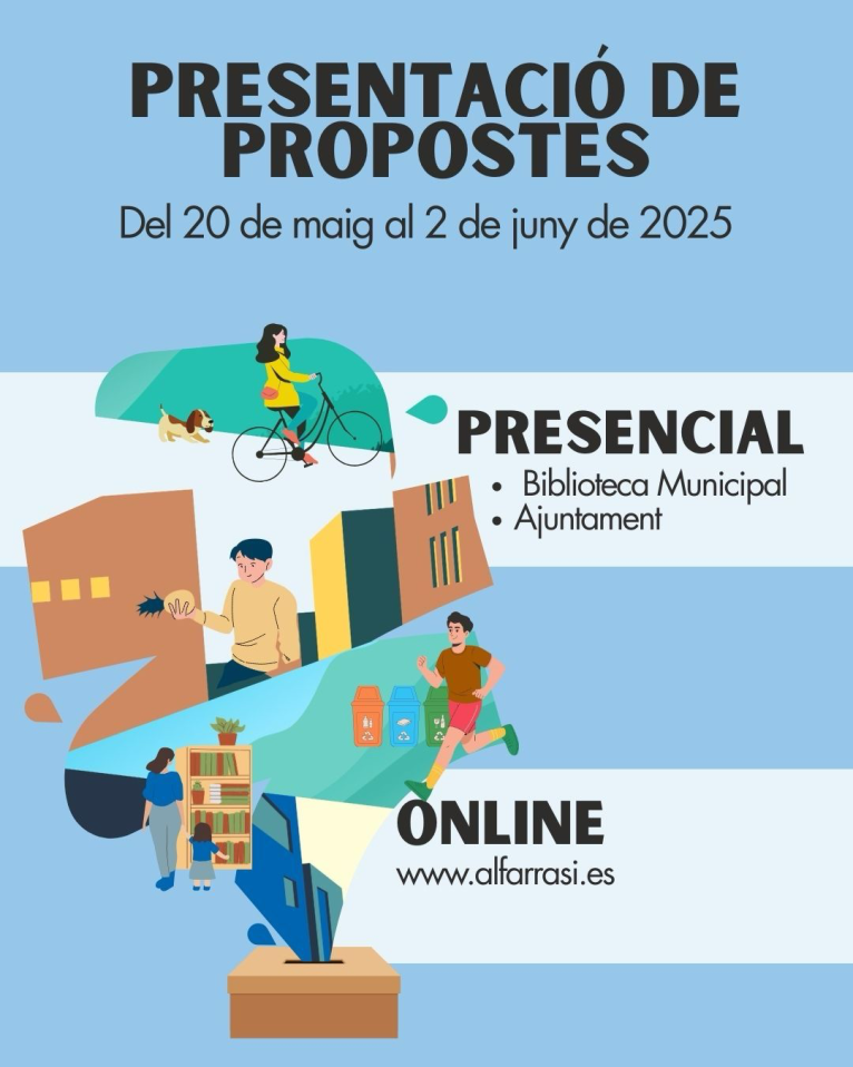 L’Ajuntament d’Alfarrasí ha obert oficialment la fase de votació ciutadana del procés de pressupostos participatius “Alfarrasí Decideix 2026”. A partir d’aquest dimecres 24 de juny i fins a l’11 de juliol, les veïnes i els veïns del municipi poden triar quines propostes volen que es facen realitat amb una inversió total de 40.000 € del pressupost municipal.Durant la fase de recollida de propostes, s’han rebut un total de 74 aportacions ciutadanes. Després d’un procés tècnic d’anàlisi, s’han agru…